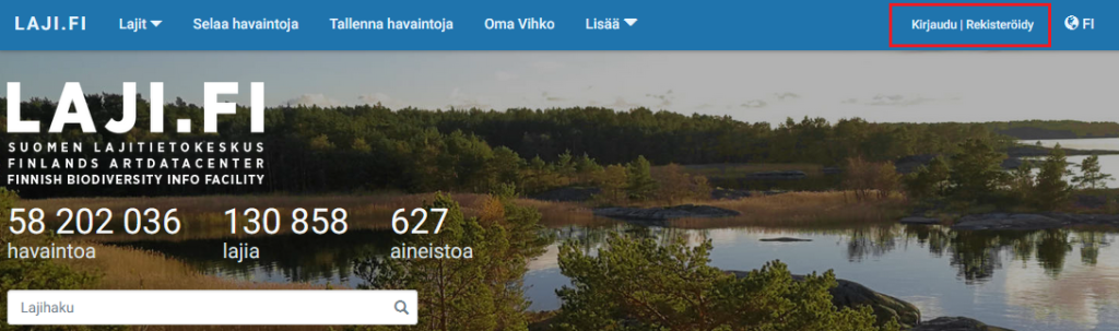 1. Kirjaudu sisään Laji.fi-palveluun osoitteessa laji.fi.