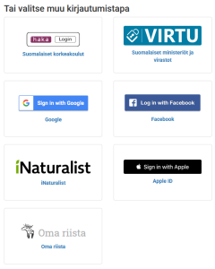 • Tunnistautumistapoja (esim. Google, Facebook, iNaturalist, Haka)